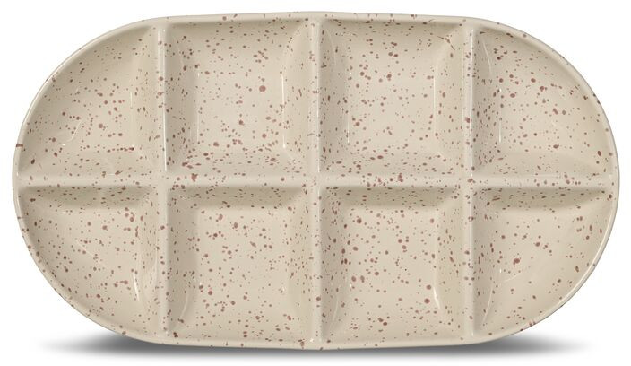 Jedno naczynie – wiele możliwości. Patera/serwingowy talerz Ditte pomieści tapas, taco czy różne przekąski na jednym talerzu. Utrzymany w beżowym odcieniu z delikatnym bordowym wzorem w formie plamek, jest zarówno praktyczny, jak i elegancki. Zamiast wielu małych miseczek to rozwiązanie oszczędza miejsce na stole i zmniejsza ilość zmywania. Nowy, większy rozmiar oraz owalny kształt zapewniają dodatkową przestrzeń w porównaniu z okrągłym odpowiednikiem z tej samej serii. Ditte jest ręcznie wykonany, dlatego kolor i faktura mogą się różnić – każdy egzemplarz jest unikatowy. Wykonany z kamionki. Projekt: Studio Sagaform. Dostarczany w klasycznym pudełku prezentowym. Nadaje się do mycia w zmywarce i jest bezpieczny dla żywności. Ręcznie wykonane, mogą występować różnice w kolorze i strukturze.
